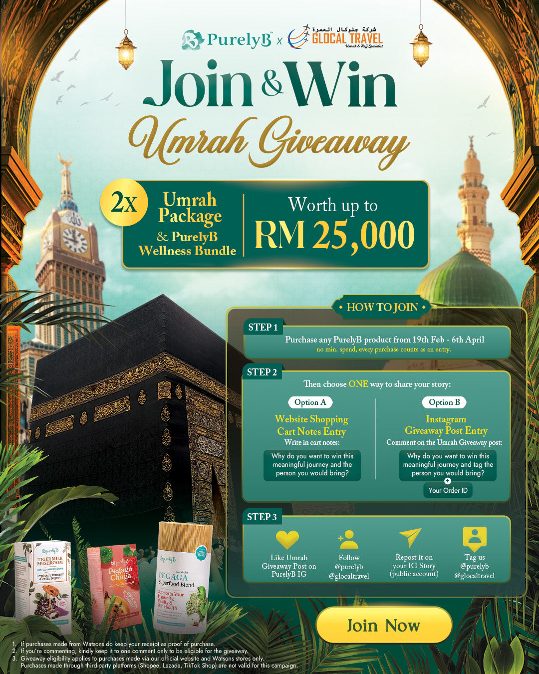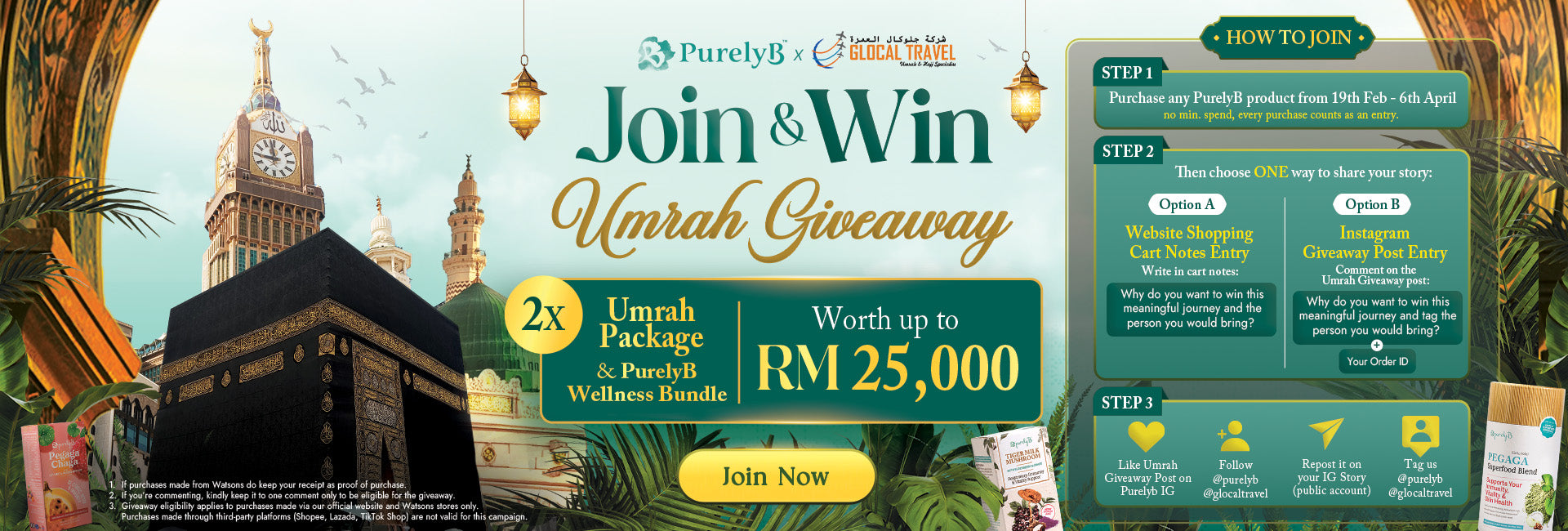 To thank you for supporting PurelyB, together with Glocal Travel, we’re gifting one winner a Sponsored Umrah Premium Package For 2 with PurelyB Wellness Bundles (worth RM1,500) to accompany you through this beautiful journey ✨